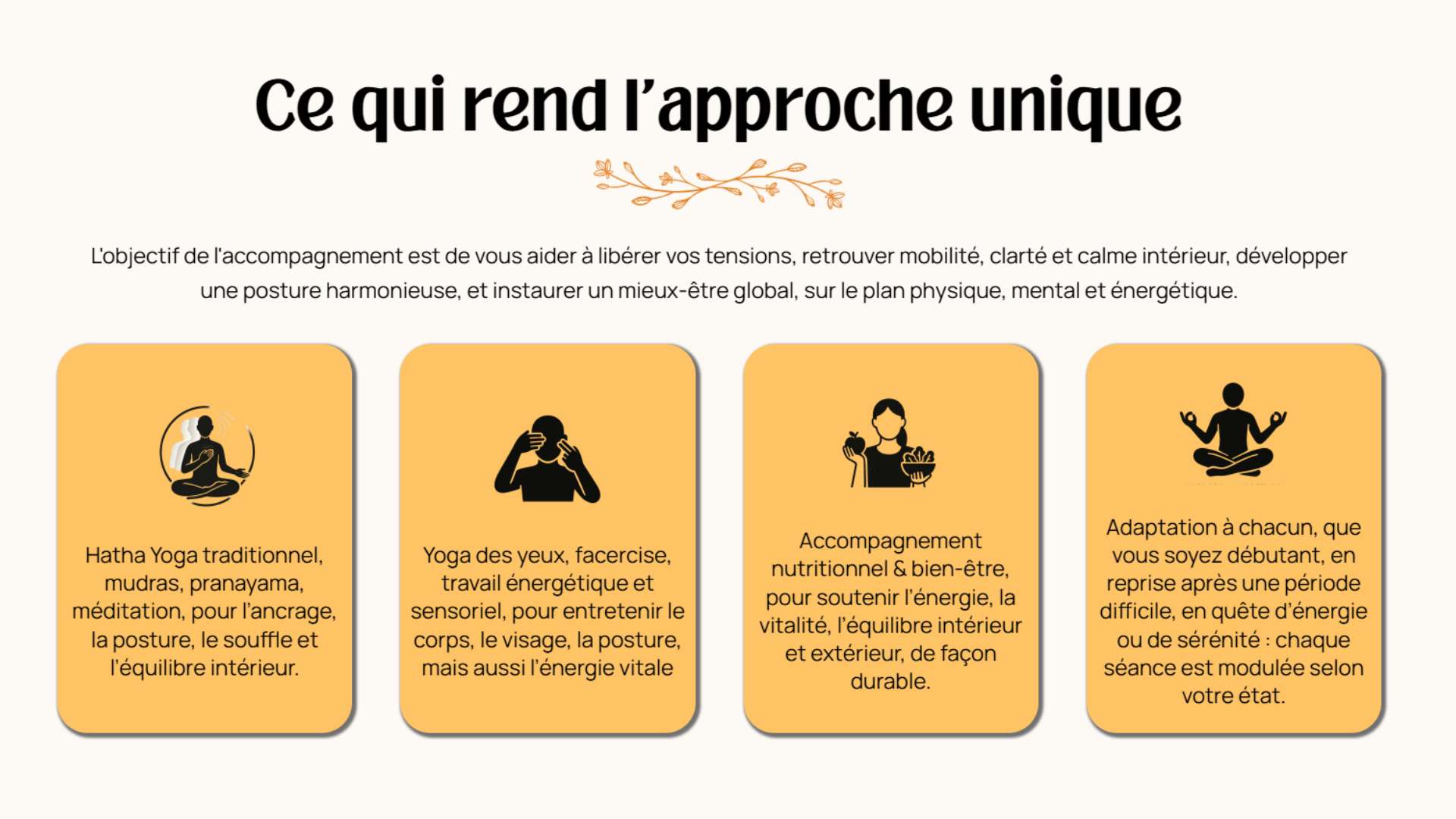 Contexte et demande du client : L’objectif était de créer une interface apaisante et harmonieuse qui reflète l'approche holistique de la cliente. Le site devait permettre de présenter ses cours de yoga, ses accompagnement et ses coaching nutritionnels de manière fluide. J’ai misé sur une ergonomie douce pour inviter à la sérénité dès la première visite. Le choix s’est porté sur une typographie à la fois élégante et lisible pour souligner le professionnalisme et la bienveillance de son accompagnement. En jouant sur la clarté des espaces, le résultat offre une navigation intuitive qui inspire confiance et calme.